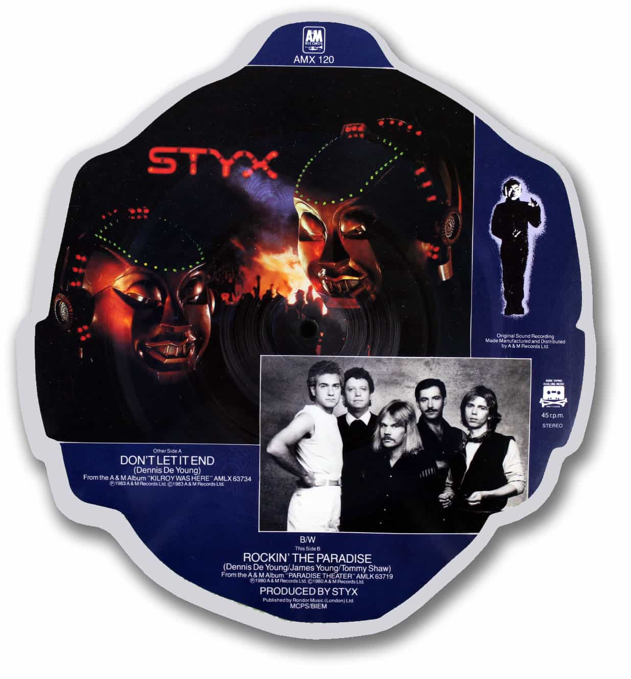 The song “Don’t Let It End” is from the album “Kilroy Was Here”. The song on the flip side of this disc is “Rockin’ The Paradise” and is from “Paradise Theater”.