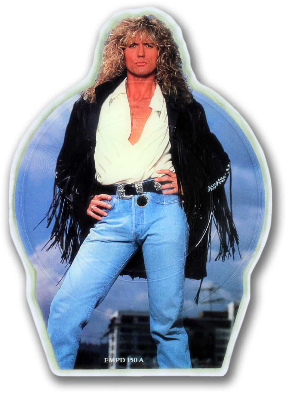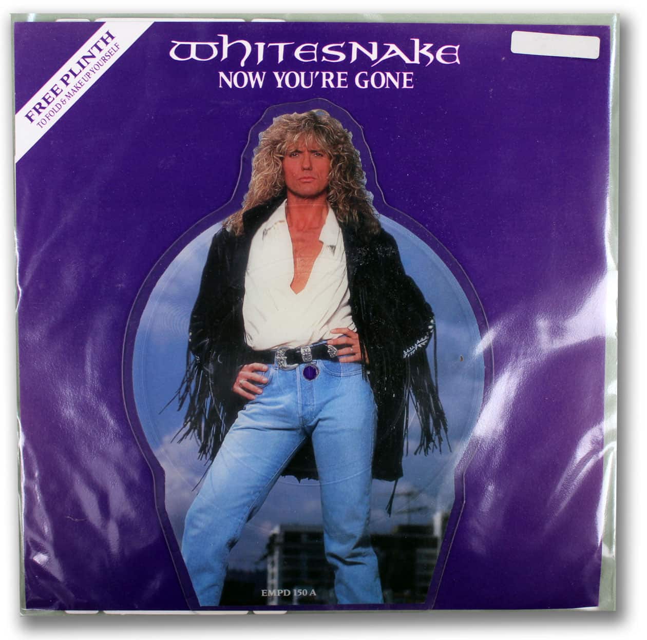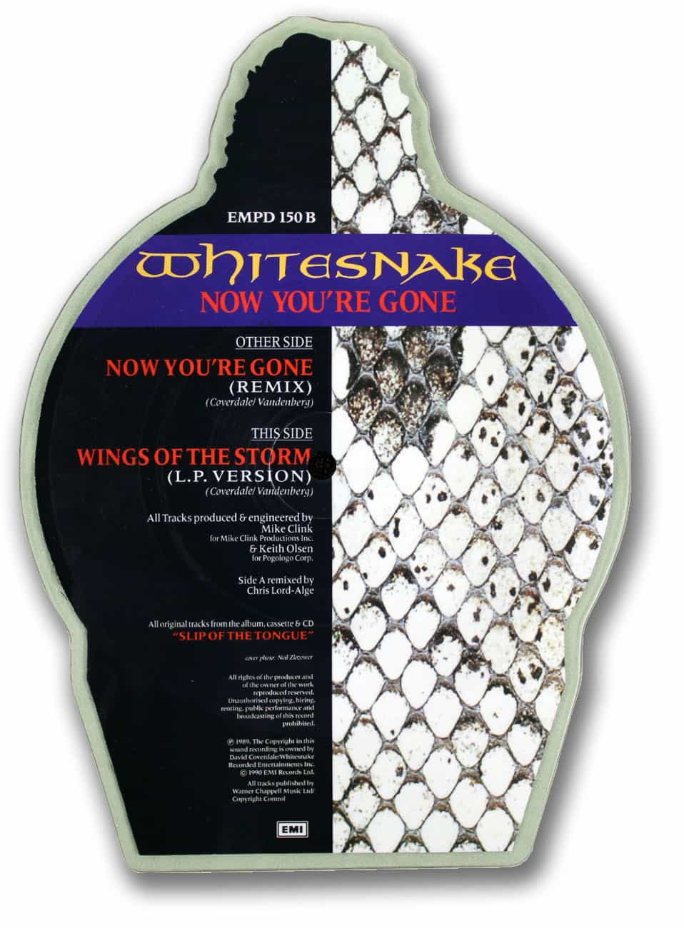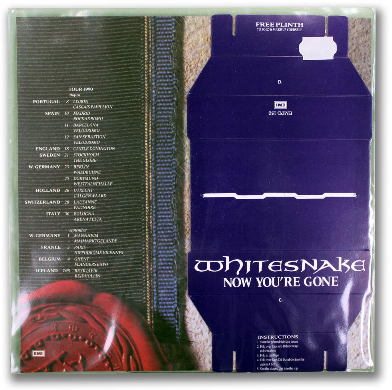 Also included in the plastic sleeve is a plinth, which allows the disc to stand erect, and a cardboard background which lists the schedule for Whitesnake’s 1990 European tour.