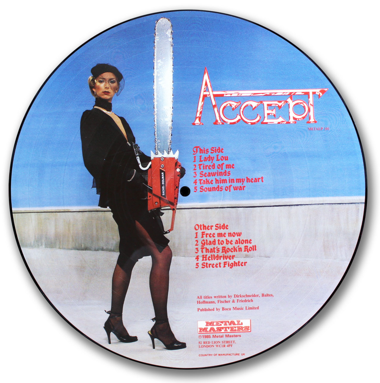 The image seen above is of the second side. This photo is called the “Chainsaw Lady”. It is a more interesting graphic than the front side, which just depicts the band in a stand up pose. This picture disc was pressed in the United Kingdom.