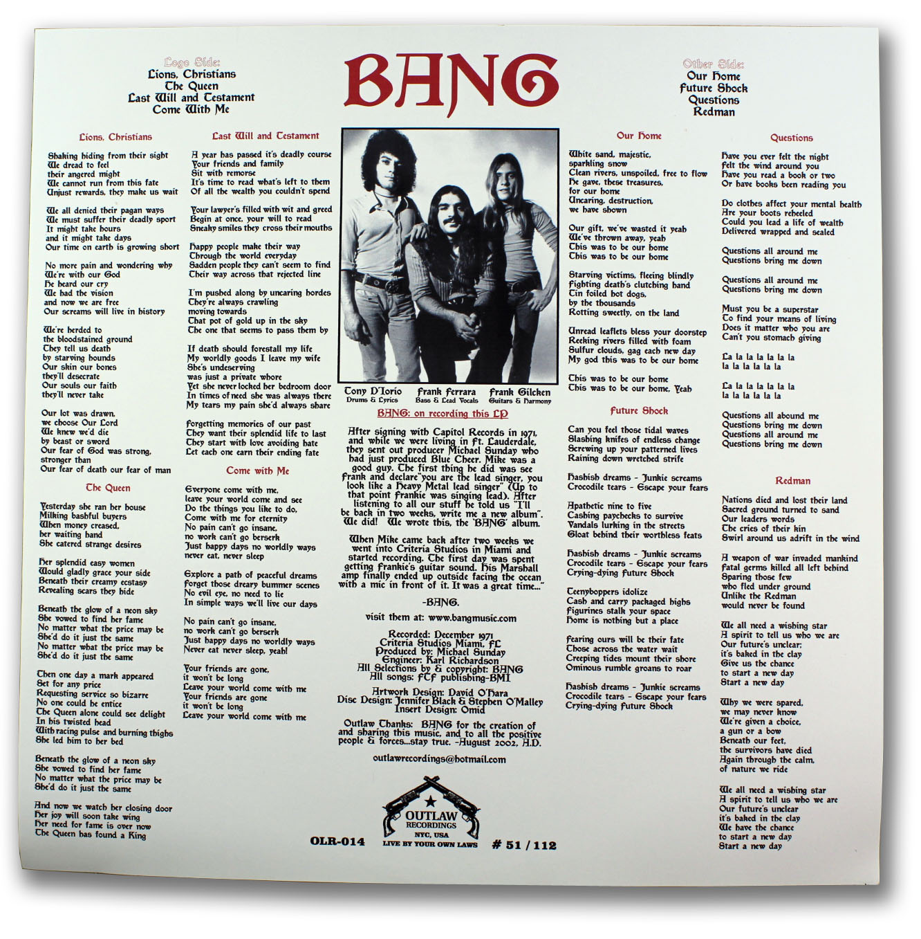Originally recorded in 1971, this was Bang’s first release on Capitol Records. This authorized picture disc was manufactured in the Czech Republic and released by Outlaw Records of New York.
