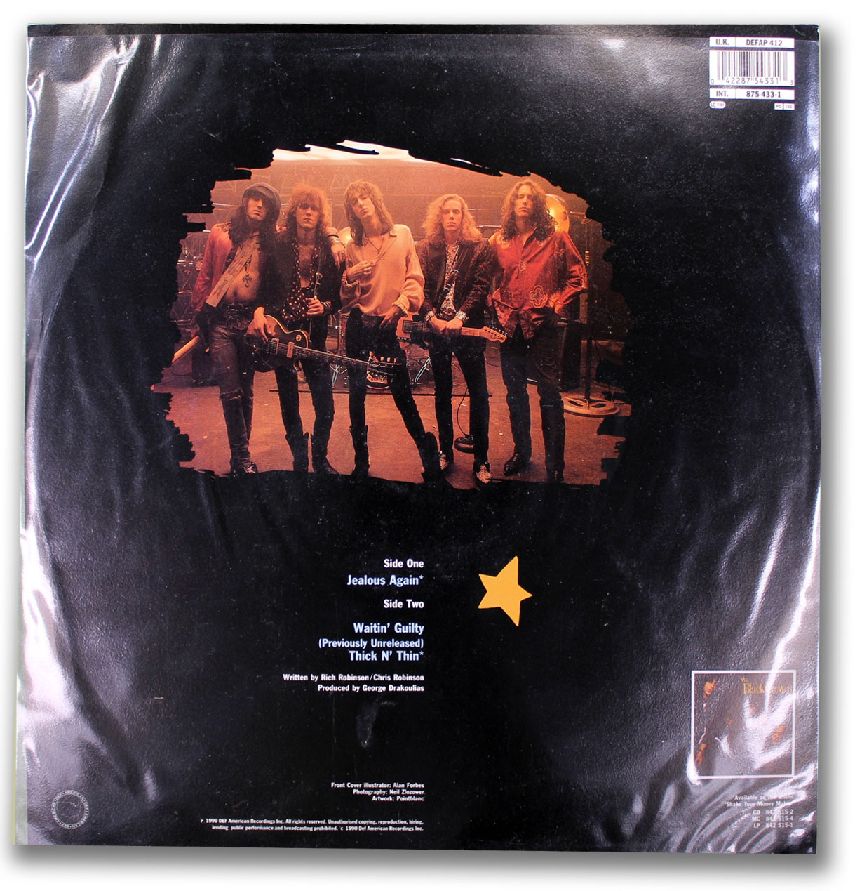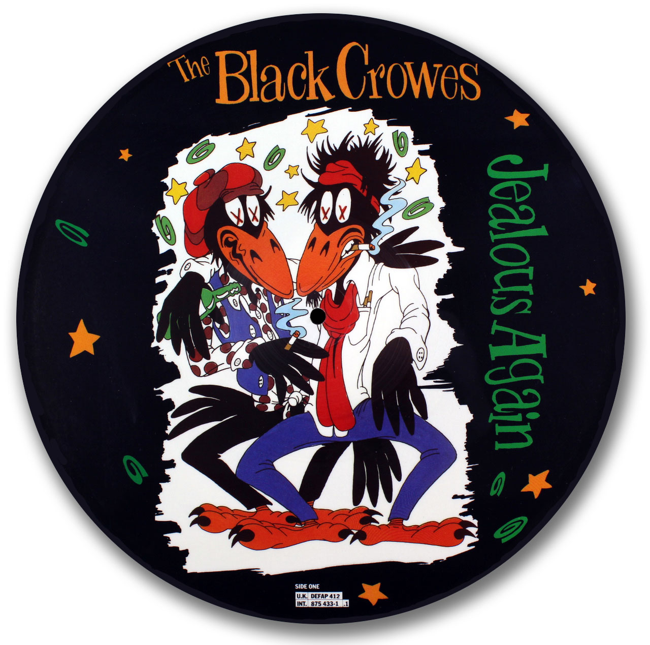 This is a 12in. single featuring “Jealous Again” from the “Shake Your Money Maker” album on side one. “Waitin’ Guilty (previously unreleased)/Thick N’ Thin” on side two. This disc was pressed in the U.K. Black Crowes, Jealous Again Picture Disc